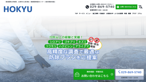 ブログは2026年1月から4月にかけて毎月更新されており、「害虫の種類」「害虫を放置するリスク」「害虫駆除に適したタイミング」「マンションの害虫駆除は誰が行う?」というテーマが並ぶ。コラムでは「業者選びの5つのポイント」「料金を賢く抑える方法」を掲載しており、初めて業者を探す人が参考にできる情報環境が整っている。かすみがうら市・つくば市・牛久市・龍ケ崎市・つくばみらい市それぞれの「害虫駆除」特設ページも用意されており、エリアごとの情報発信にも力を入れている。電話番号は029-869-5740、営業時間は9時から18時。