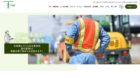 各現場への直行直帰制度と少なめの残業体制が、株式会社TN-baseの働き方の骨格を形成している。毎朝の事務所集合が不要なため、現場に直接向かえる分だけ拘束時間が短縮される。「家族や自分の時間を大切にできる環境」という言葉が採用ページに掲げられており、体力を使う現場仕事だからこそオフの質を確保するという姿勢が伝わる。本社は東京都新宿区大久保2丁目7-1、大久保フジビル709号、電話は03-6233-7381、営業時間は9時から18時で定休日は土日祝日だ。