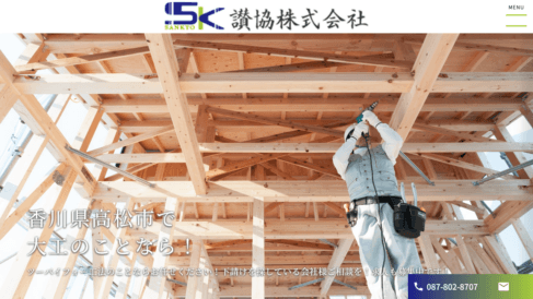 「下請けを探している会社様、ご相談を」という呼びかけをトップページに掲げており、外注パートナーとしての受付窓口が明確に設けられている。電話番号(087-802-8707)・FAX(087-802-8708)・営業時間(8:30〜17:00)が明記されており、連絡手段の選択肢が複数ある。2×4工法が基本だが、工法についても案件内容によって打ち合わせに応じており、条件の幅が広い。